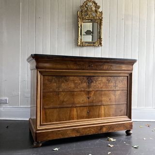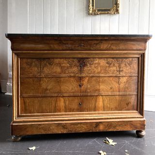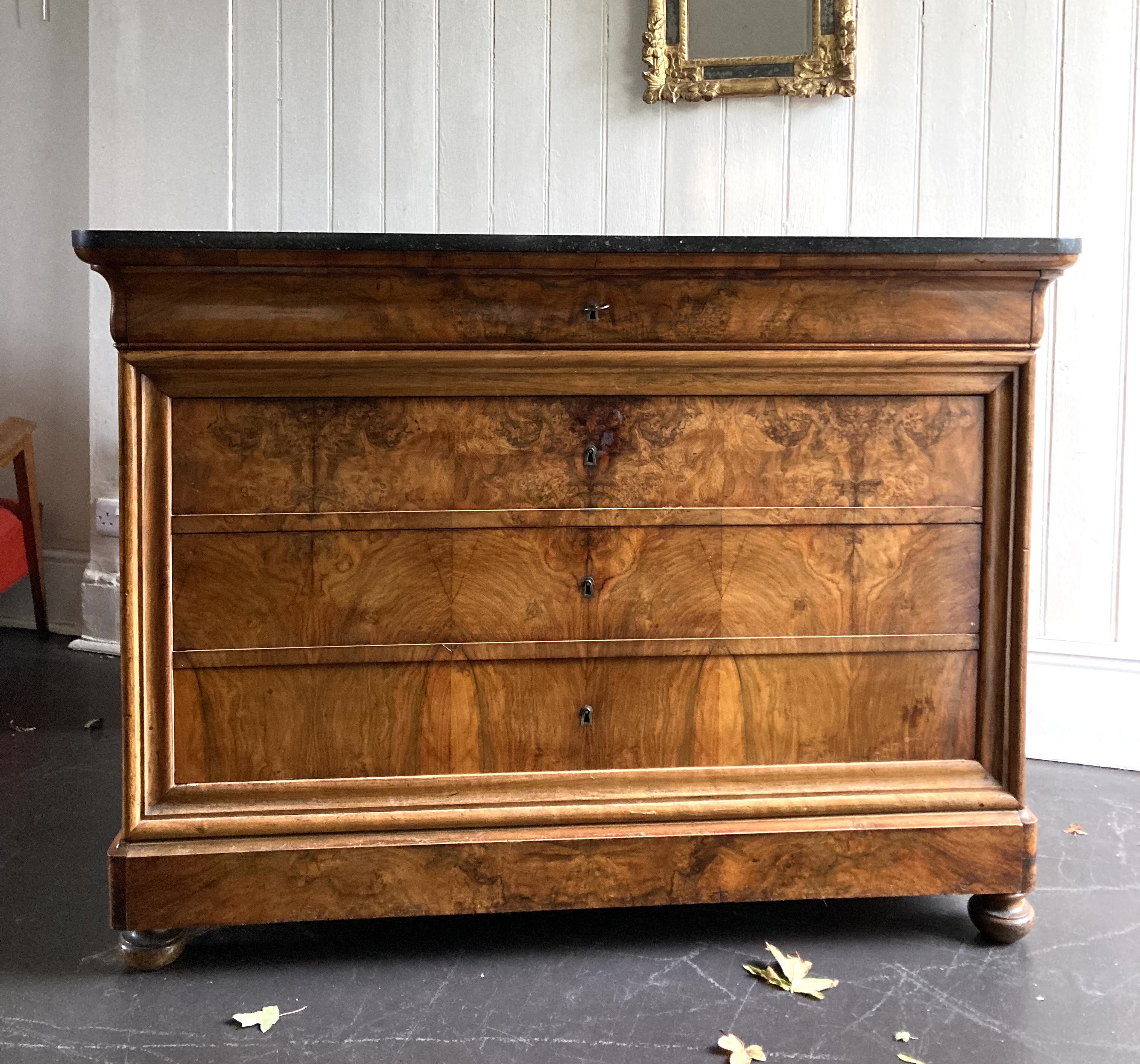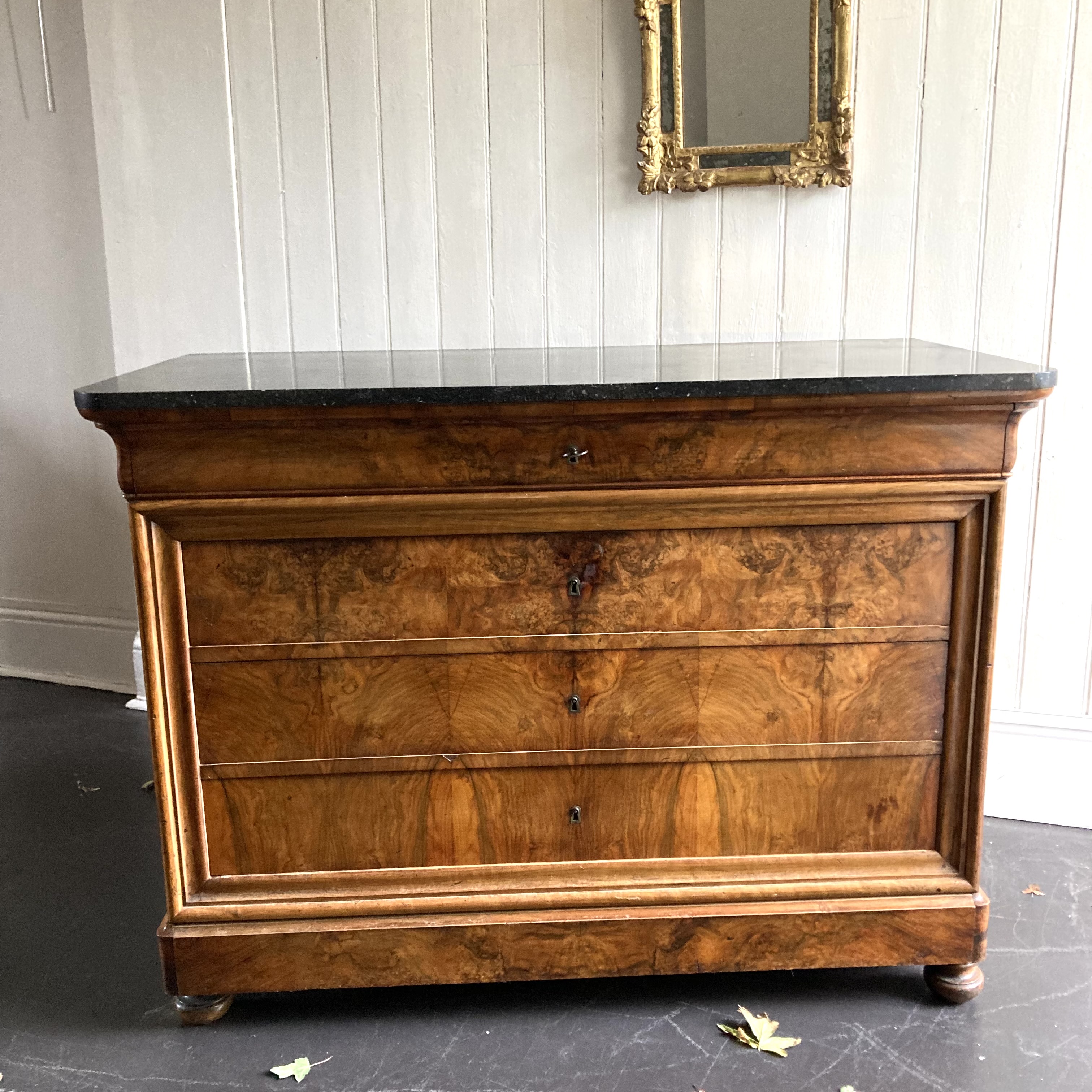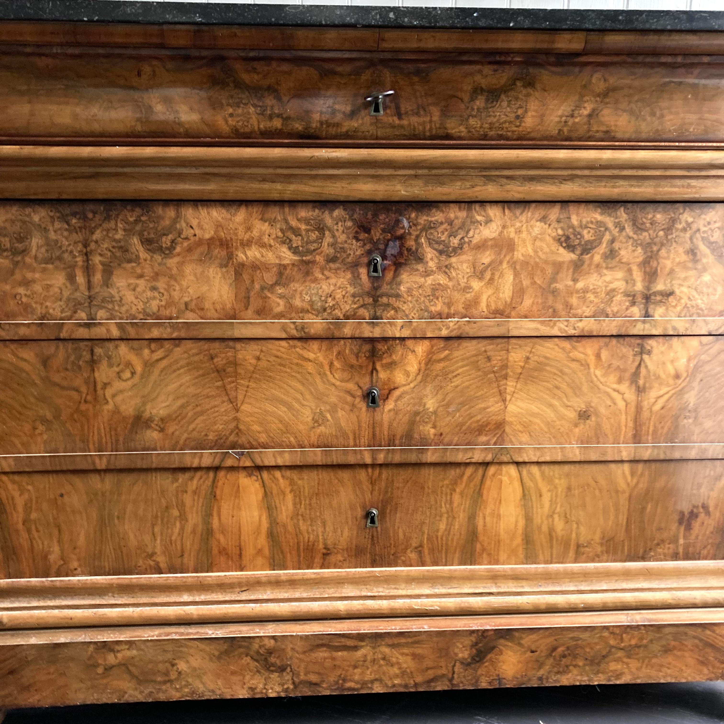 A super quality 19th century Louis Phillip burr walnut commode book matched veneer front, lwonderful colour with black Belgium marble top. Five drawers, one consealed in the plinth, brass escutcheons and working locks