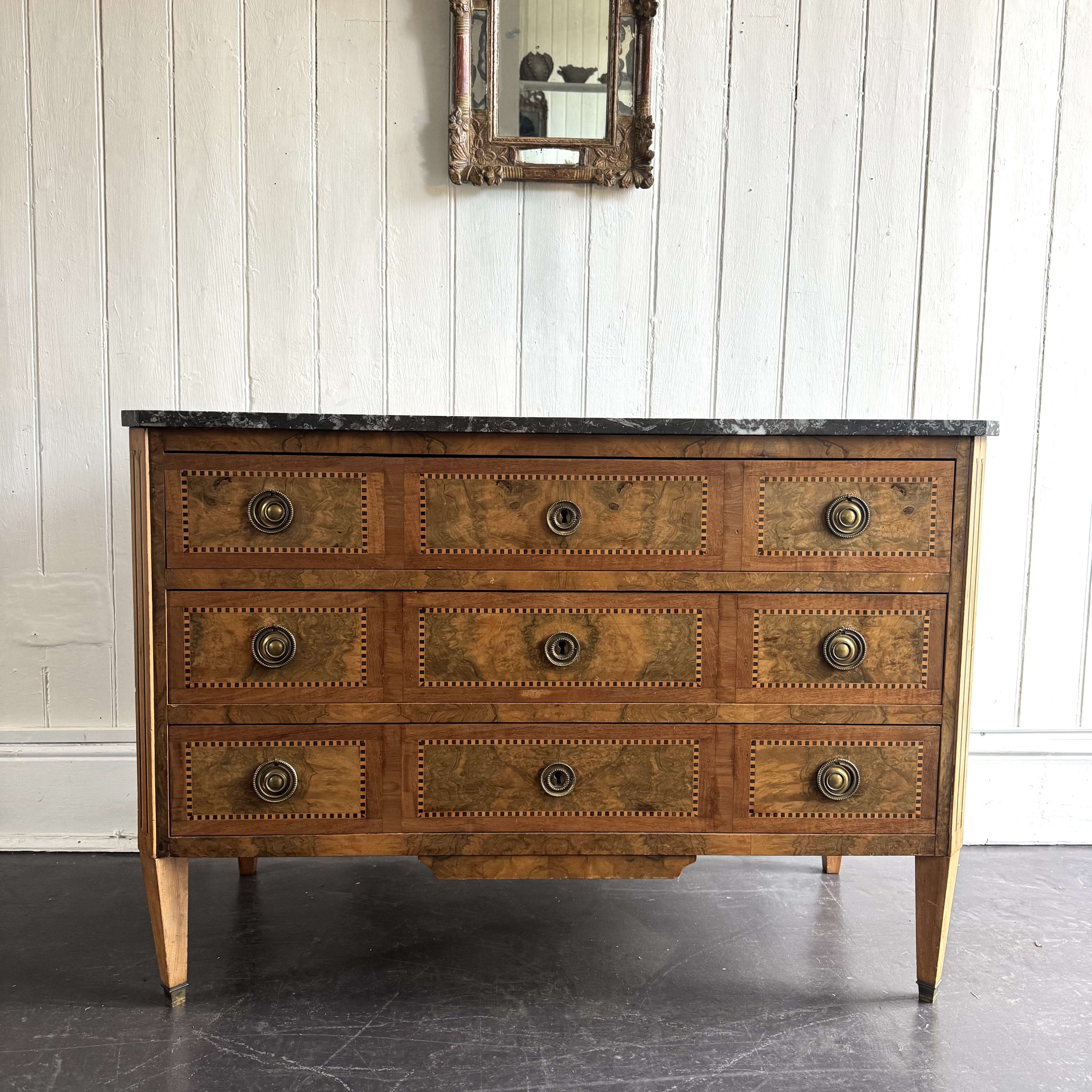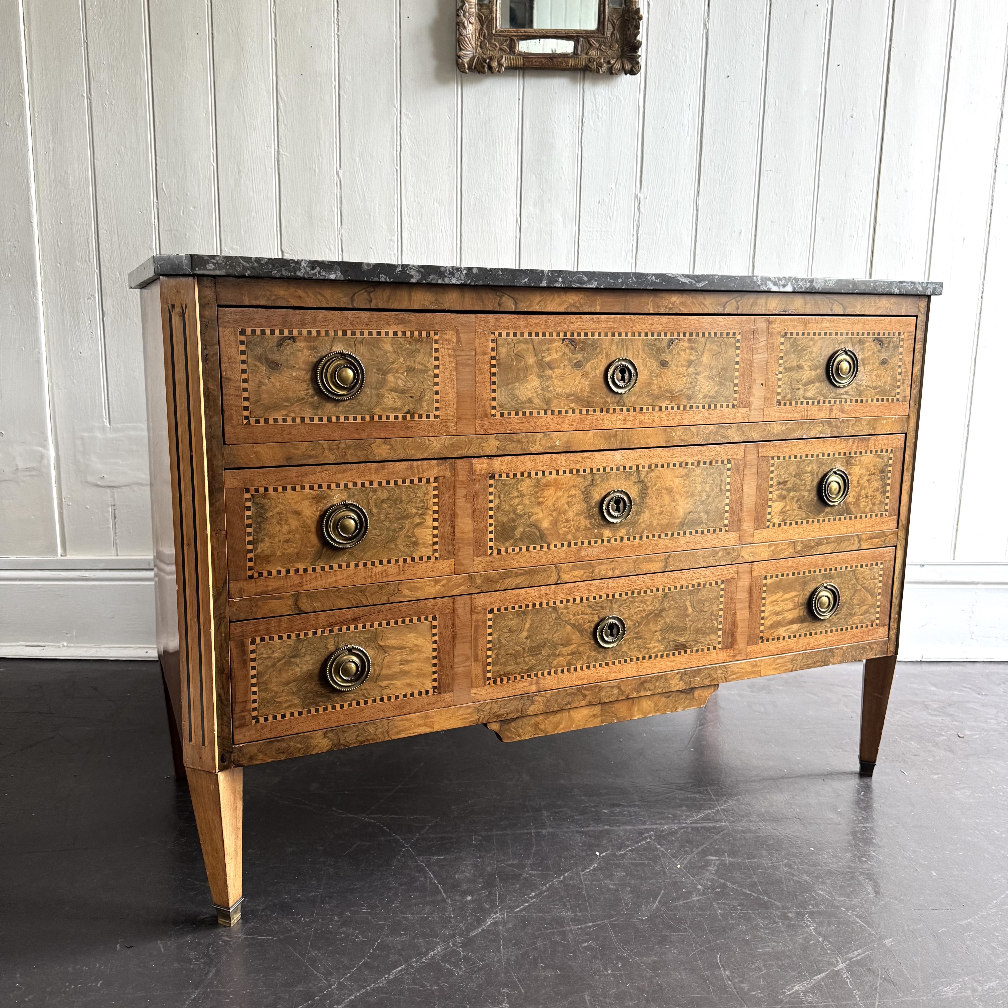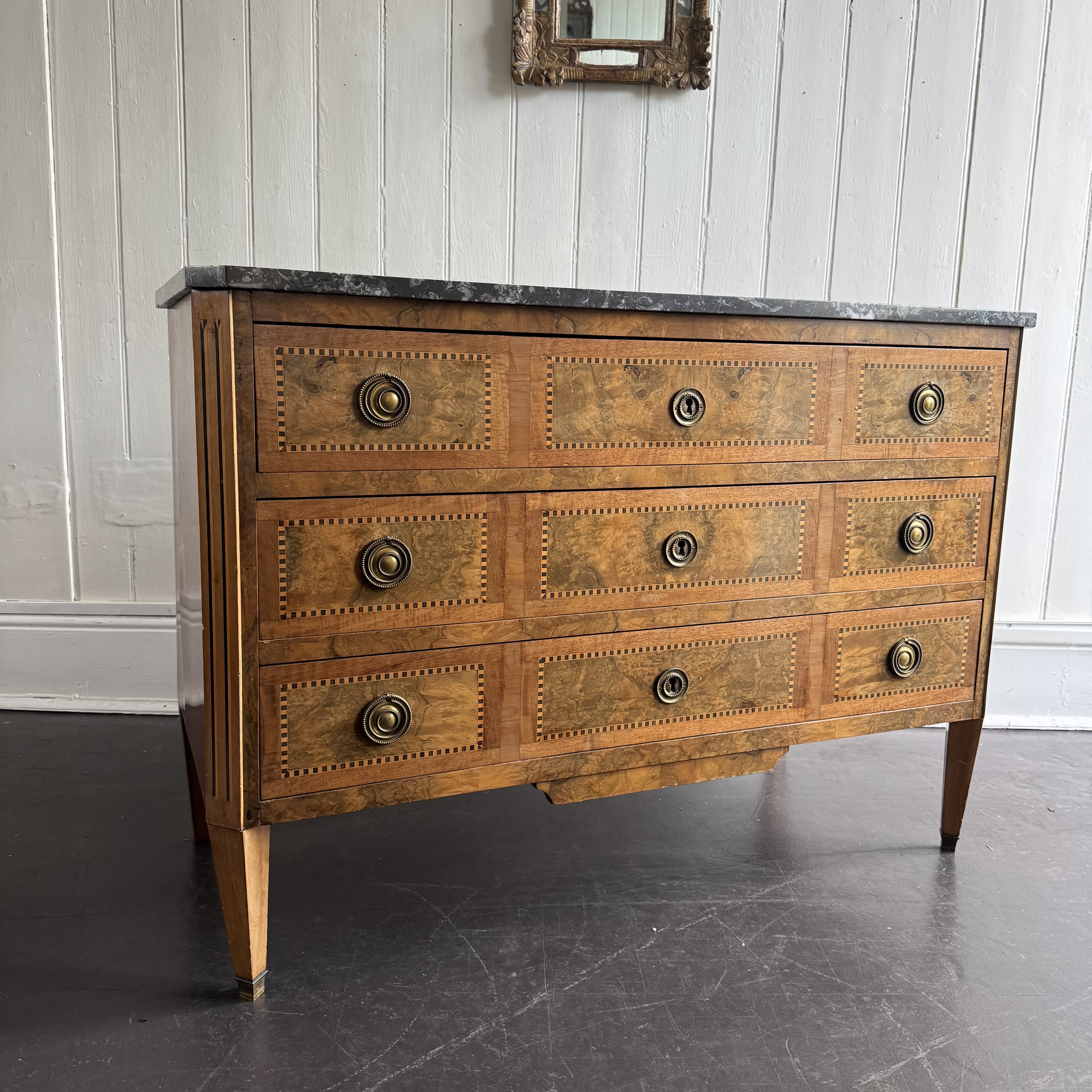 19th century French walnut commode three long drawers inlaid banding of ebony ans kingwood, retaining round brass pull handles and escutcheons, standing on tapered square legs with brass caps. Grey marble top