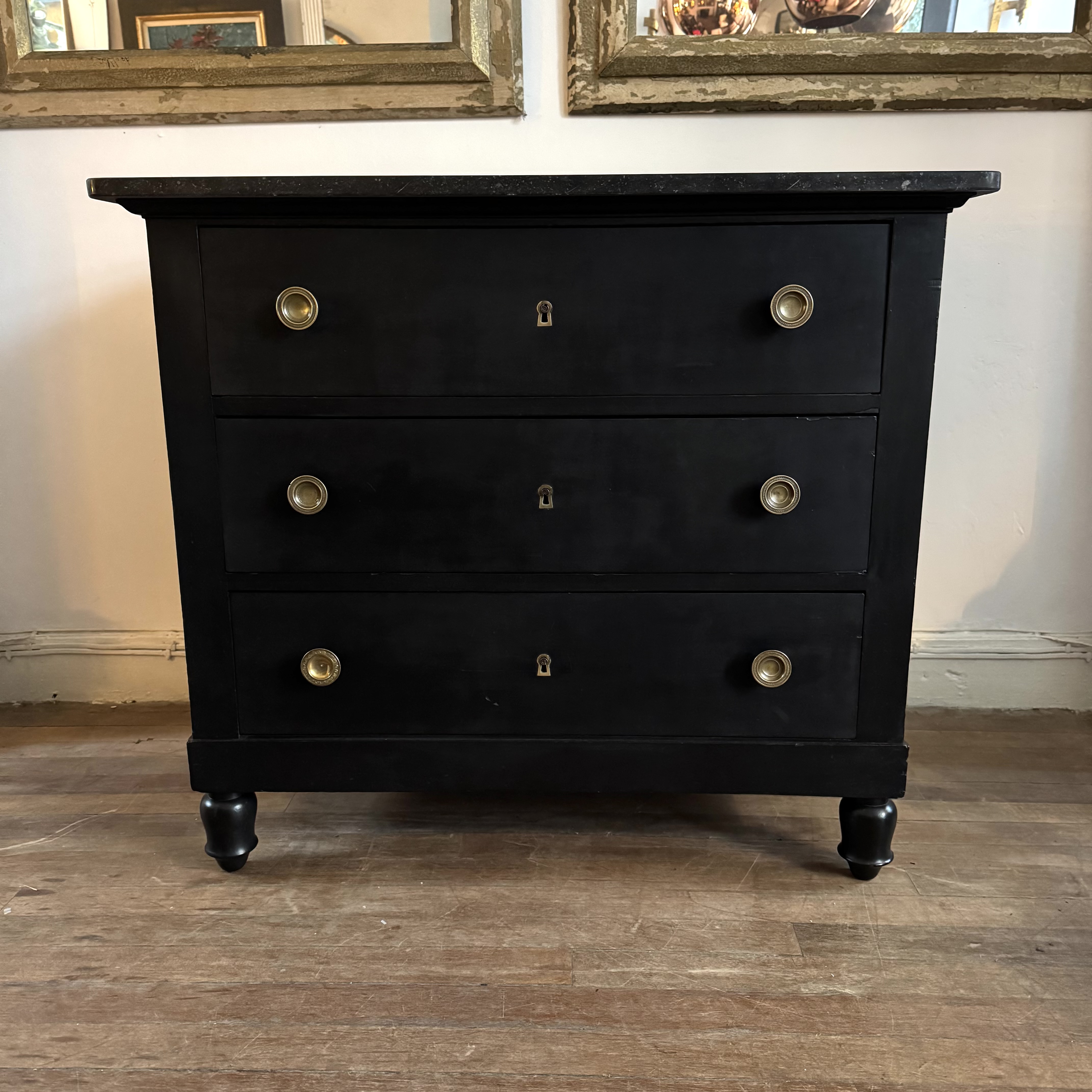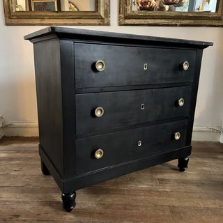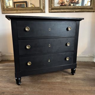 Ebonised Commode A three drawer ebonised marble top French commode with round brass pull handles and escutcheons. 19th Century H: 87 cms W: 100 cms D: 54.5 cms £1150 Share this item Email Twitter Facebook Pinterest Enquire about this item Your name Your email address (required) Your phone number Your location Any comments? Data use consent (required) I consent to my data being processed as per the Privacy Policy