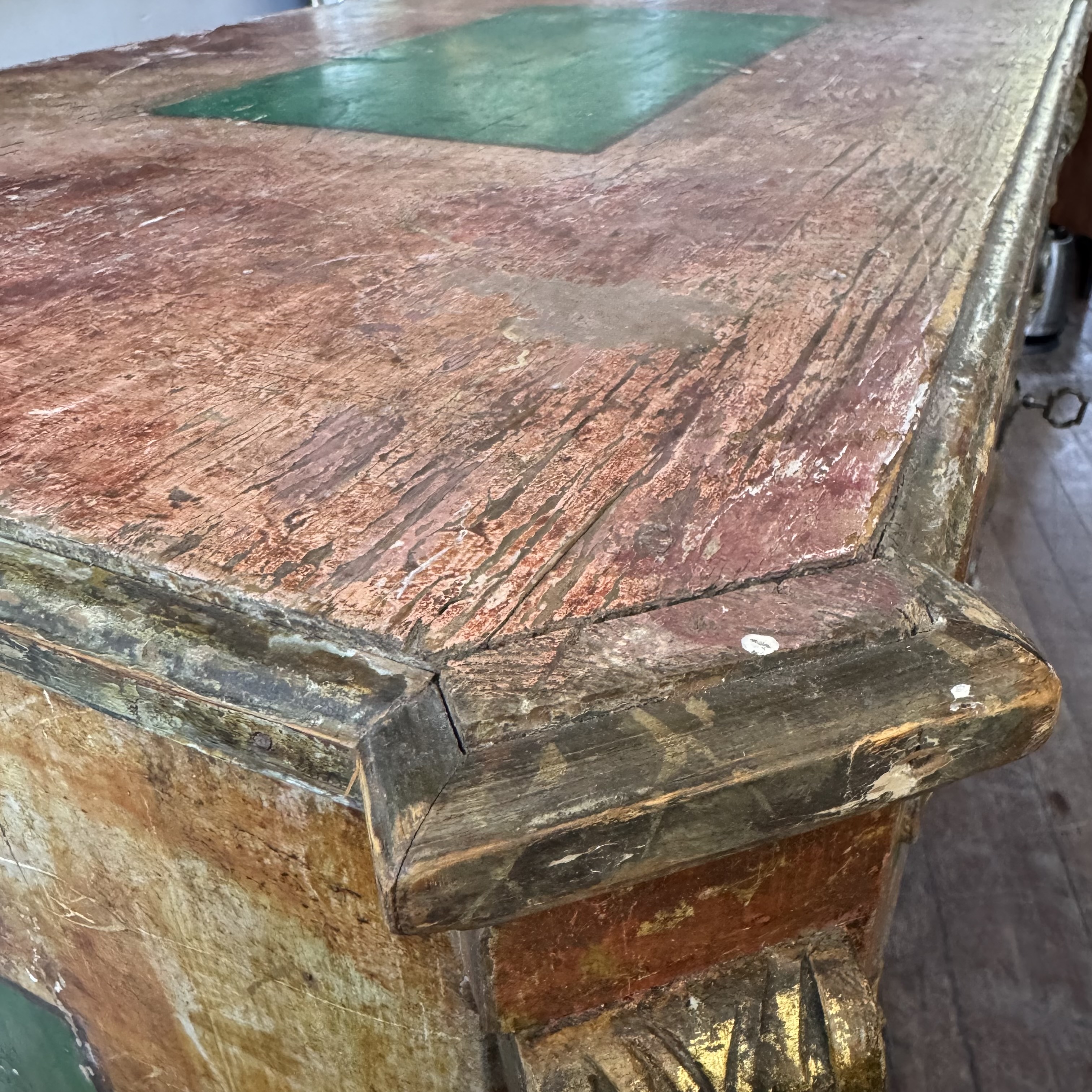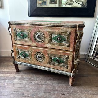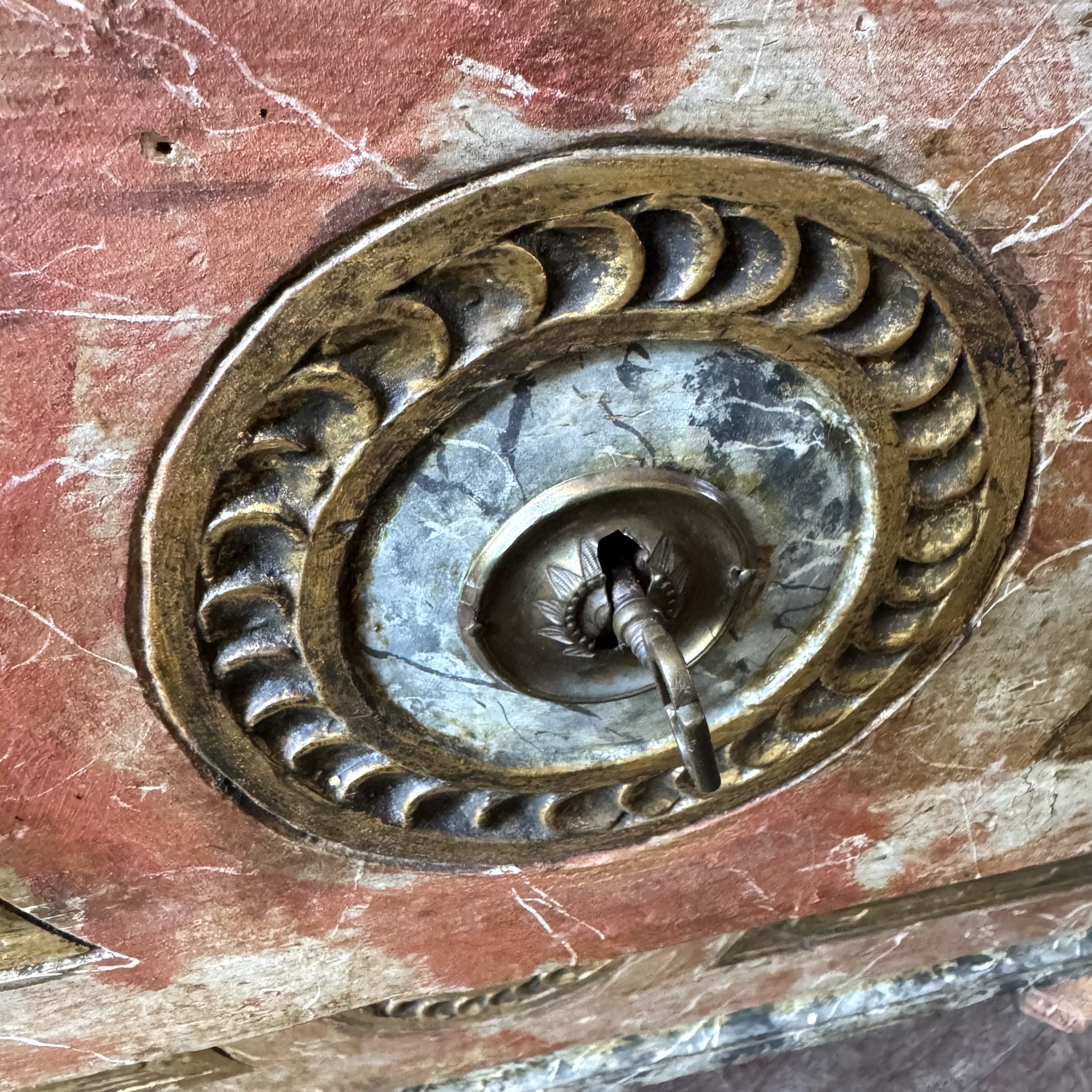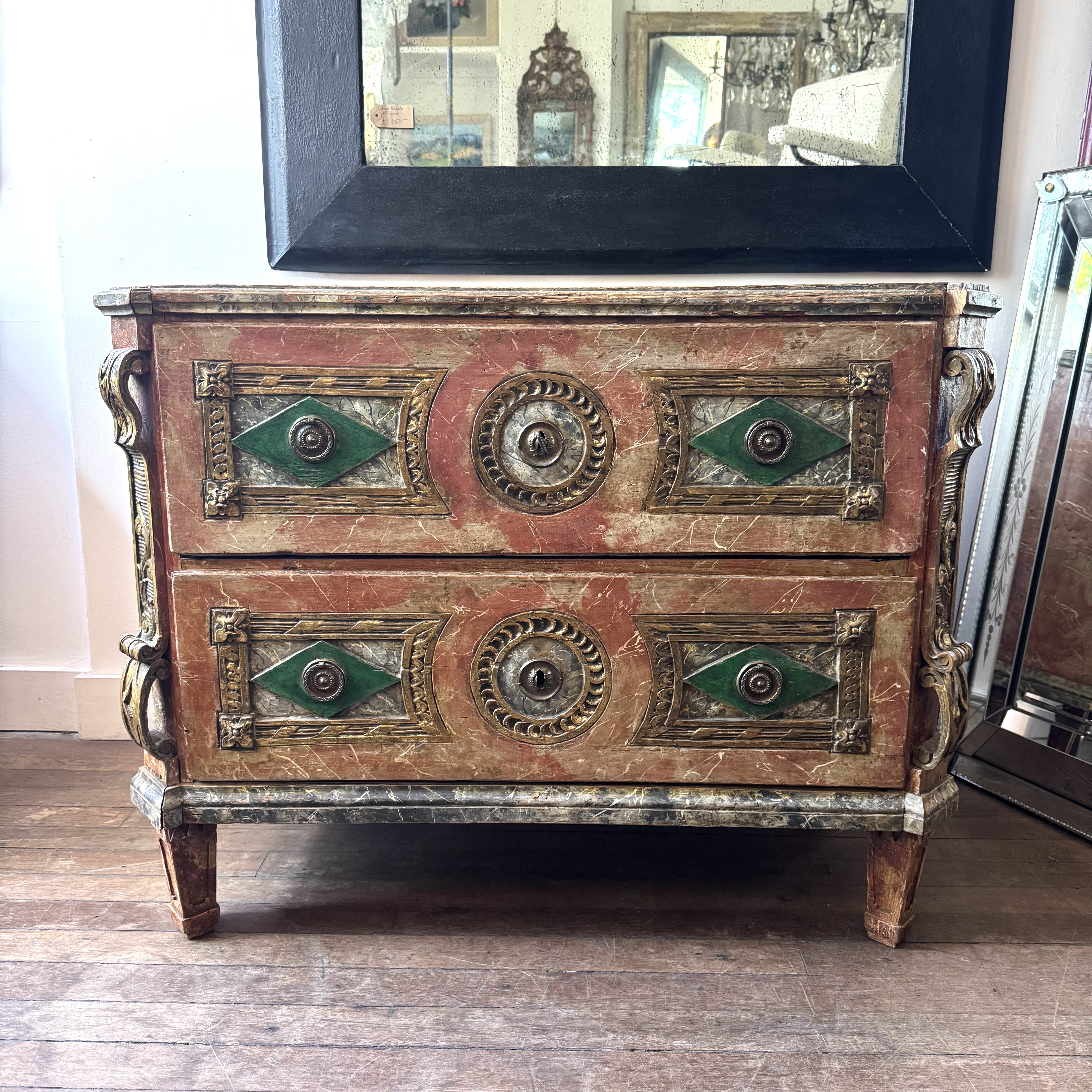 Late 18th century painted two drawer Italian commode, painted rose and grey faux marble, carved large escutcheons, round brass pull handles standing on tapered legs. C. 1790