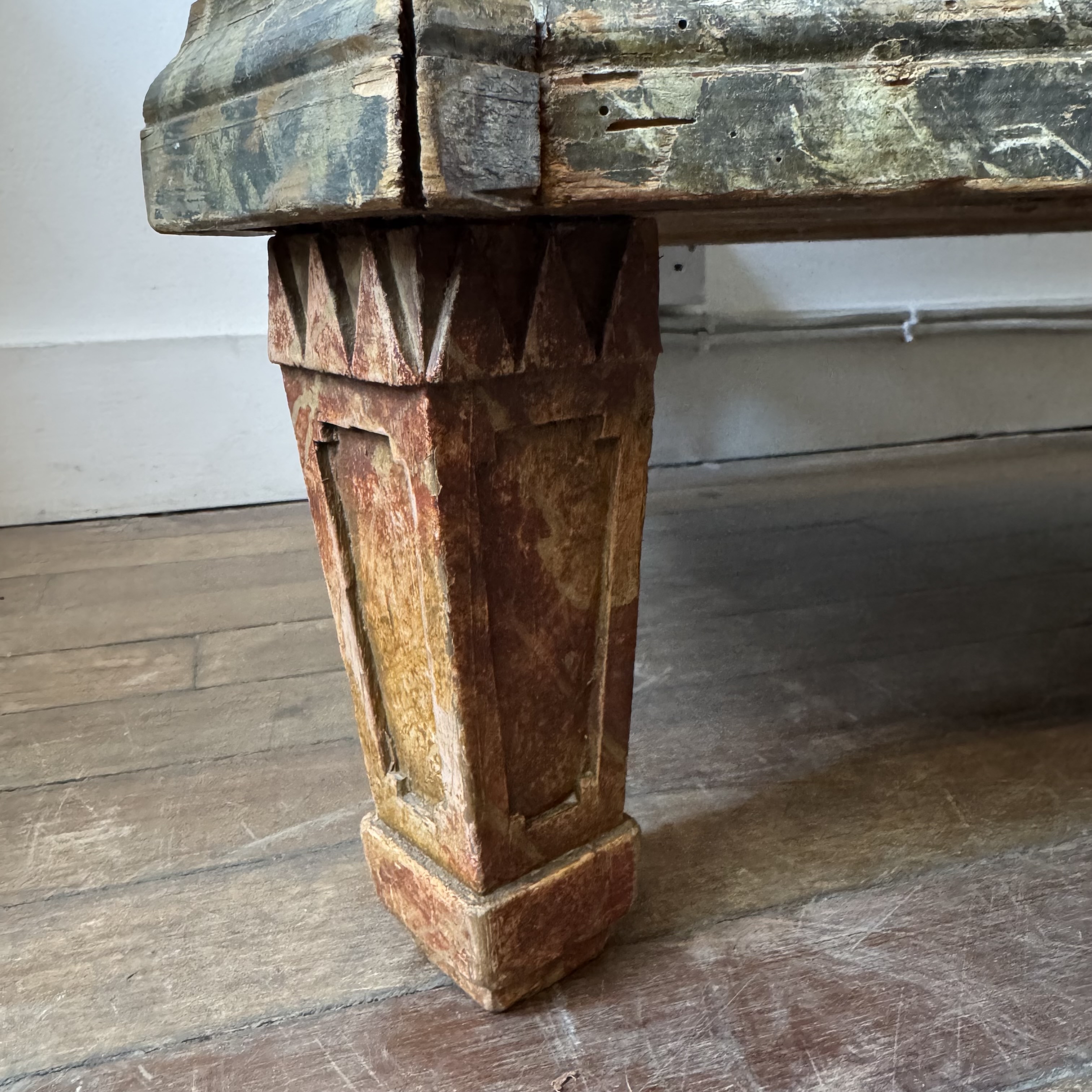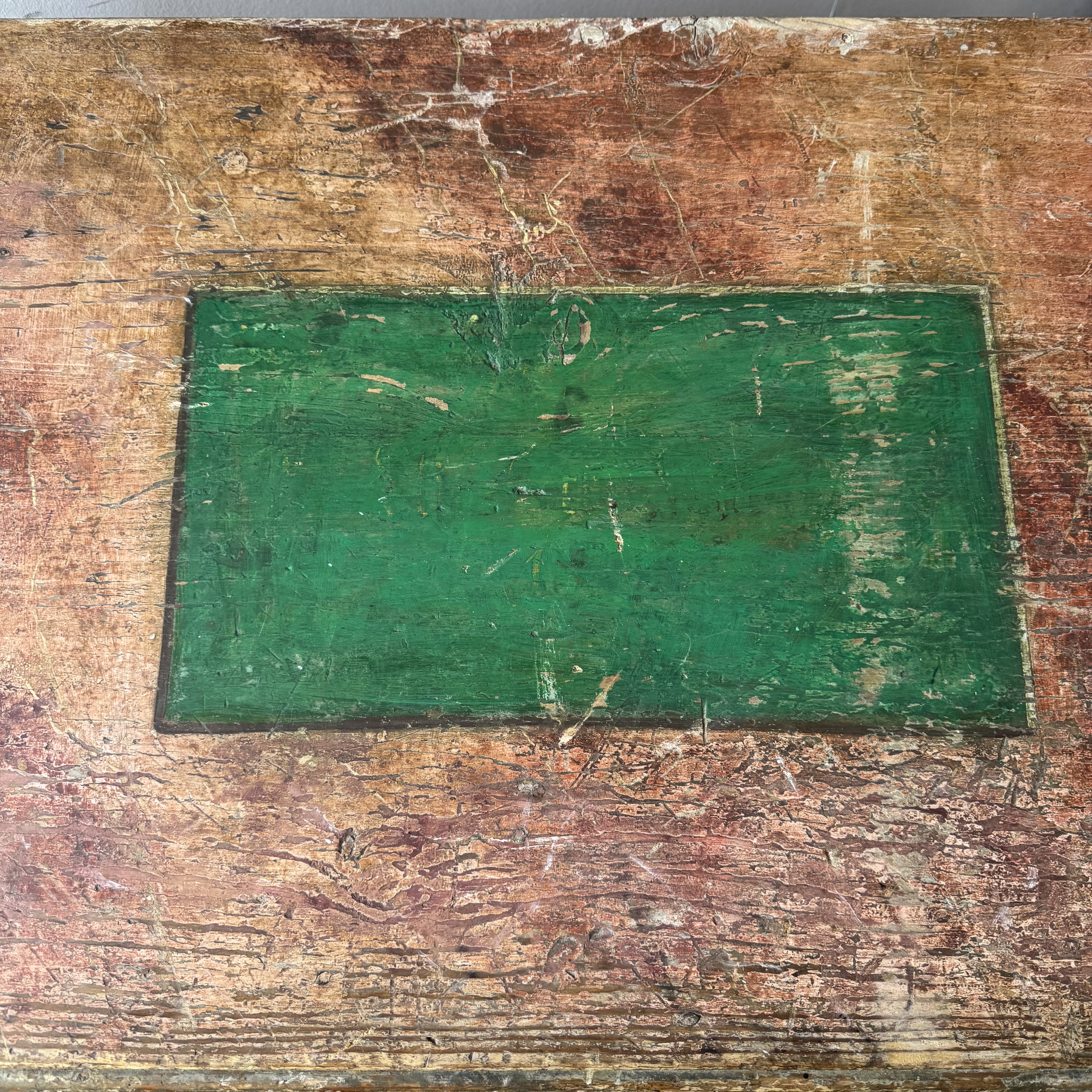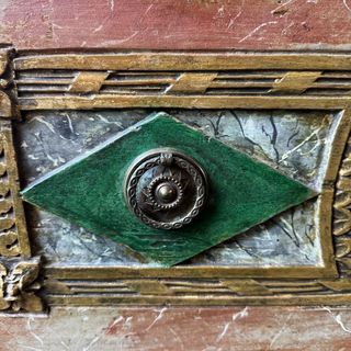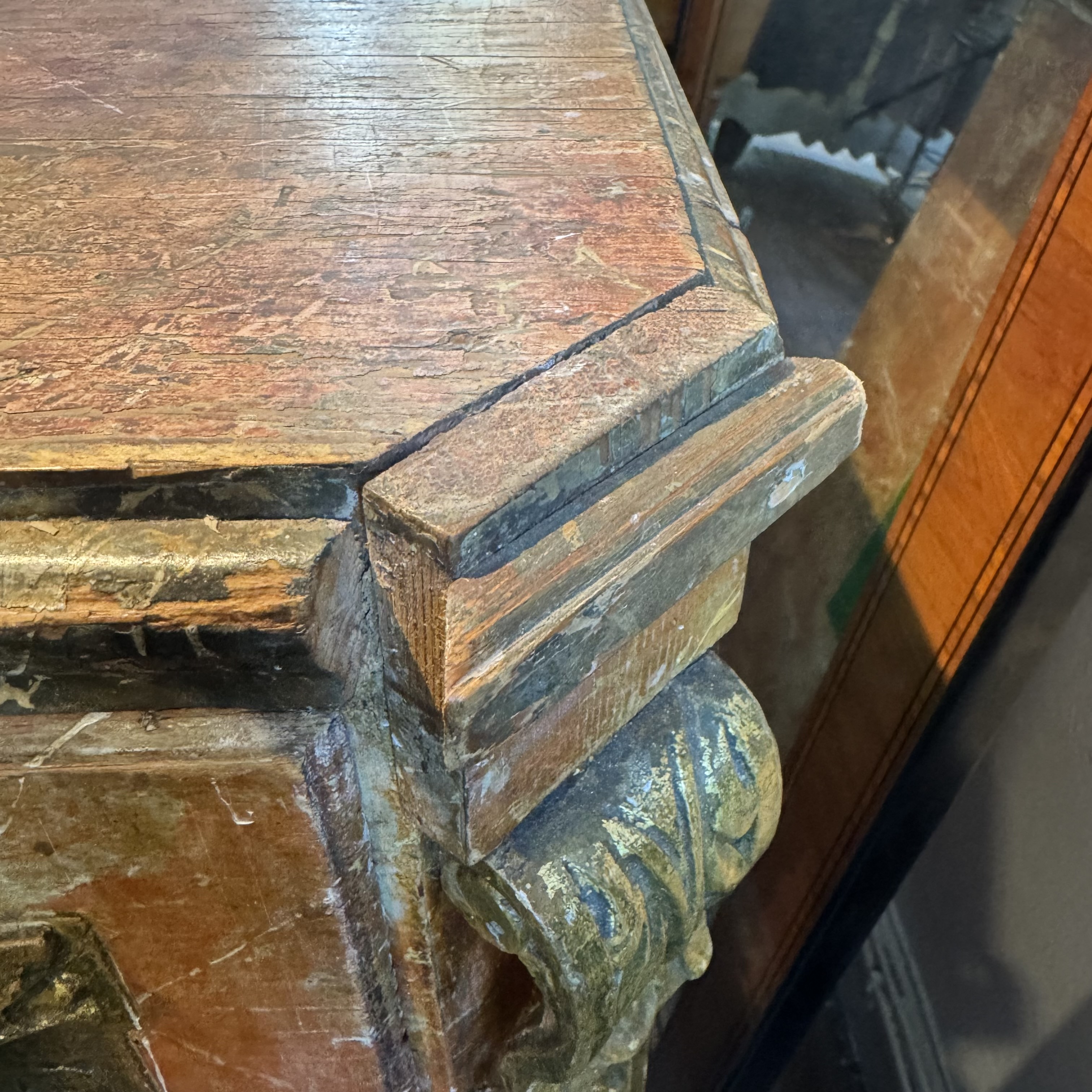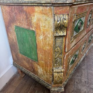 Late 18th century painted two drawer Italian commode, painted rose and grey faux marble, carved large escutcheons, round brass pull handles standing on tapered legs. C. 1790