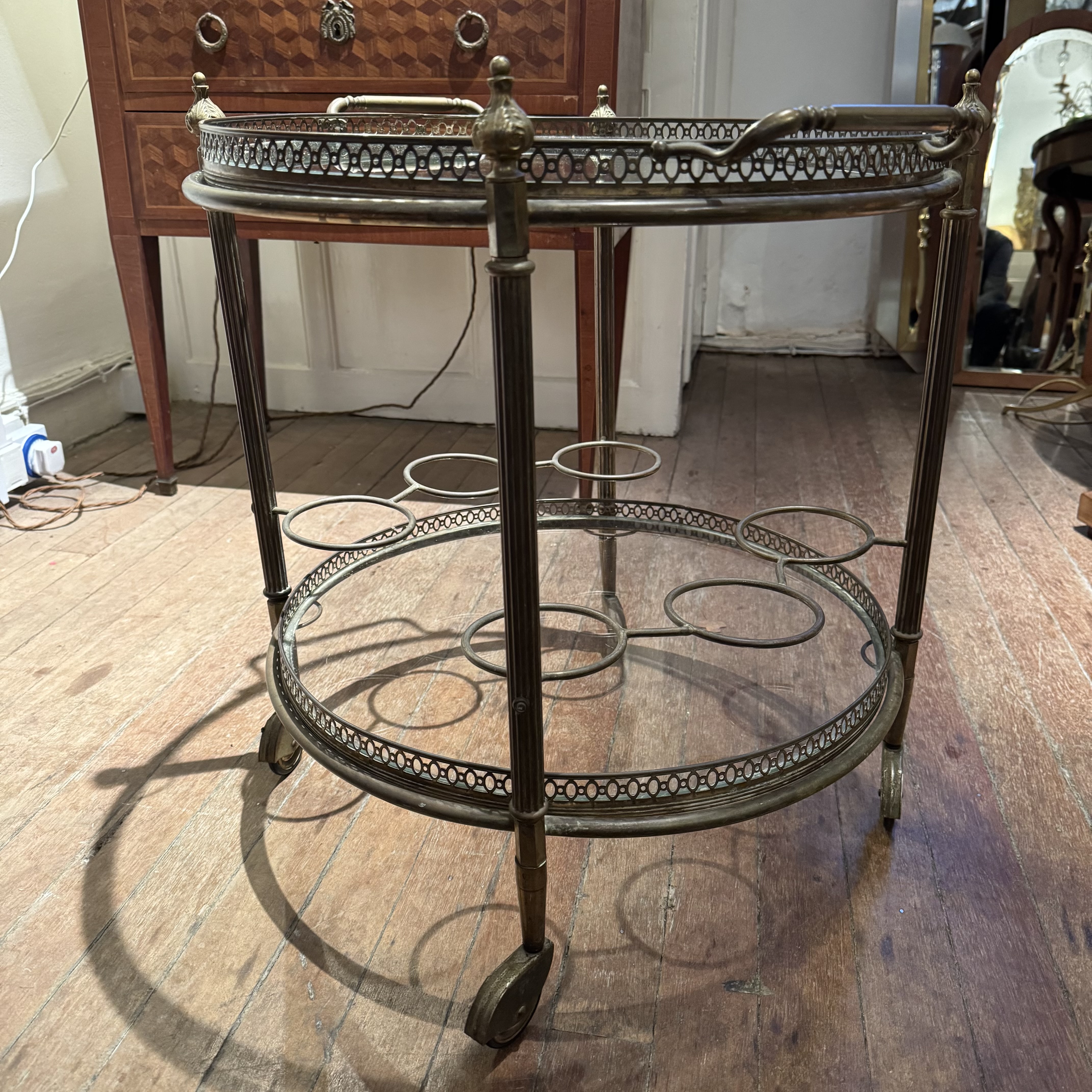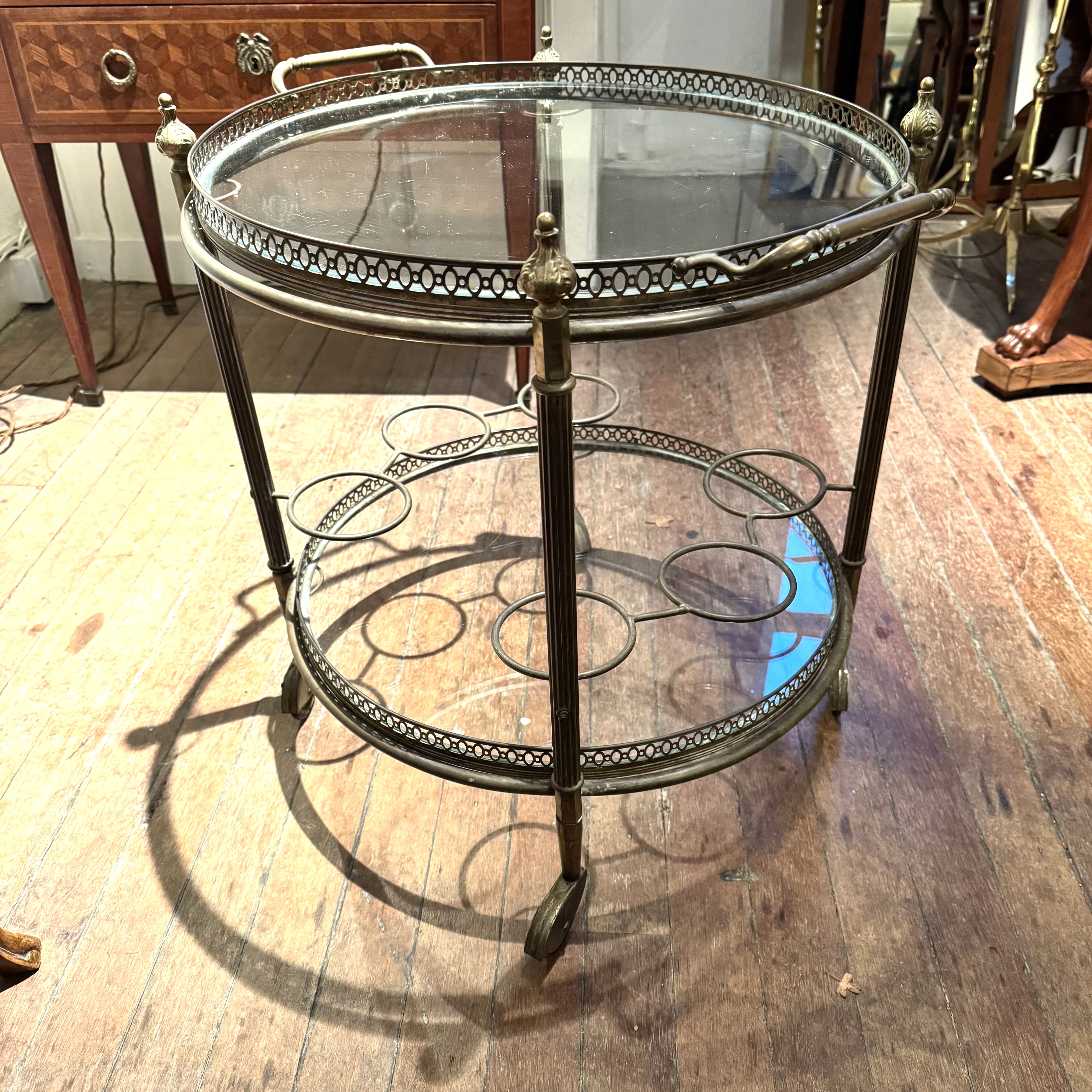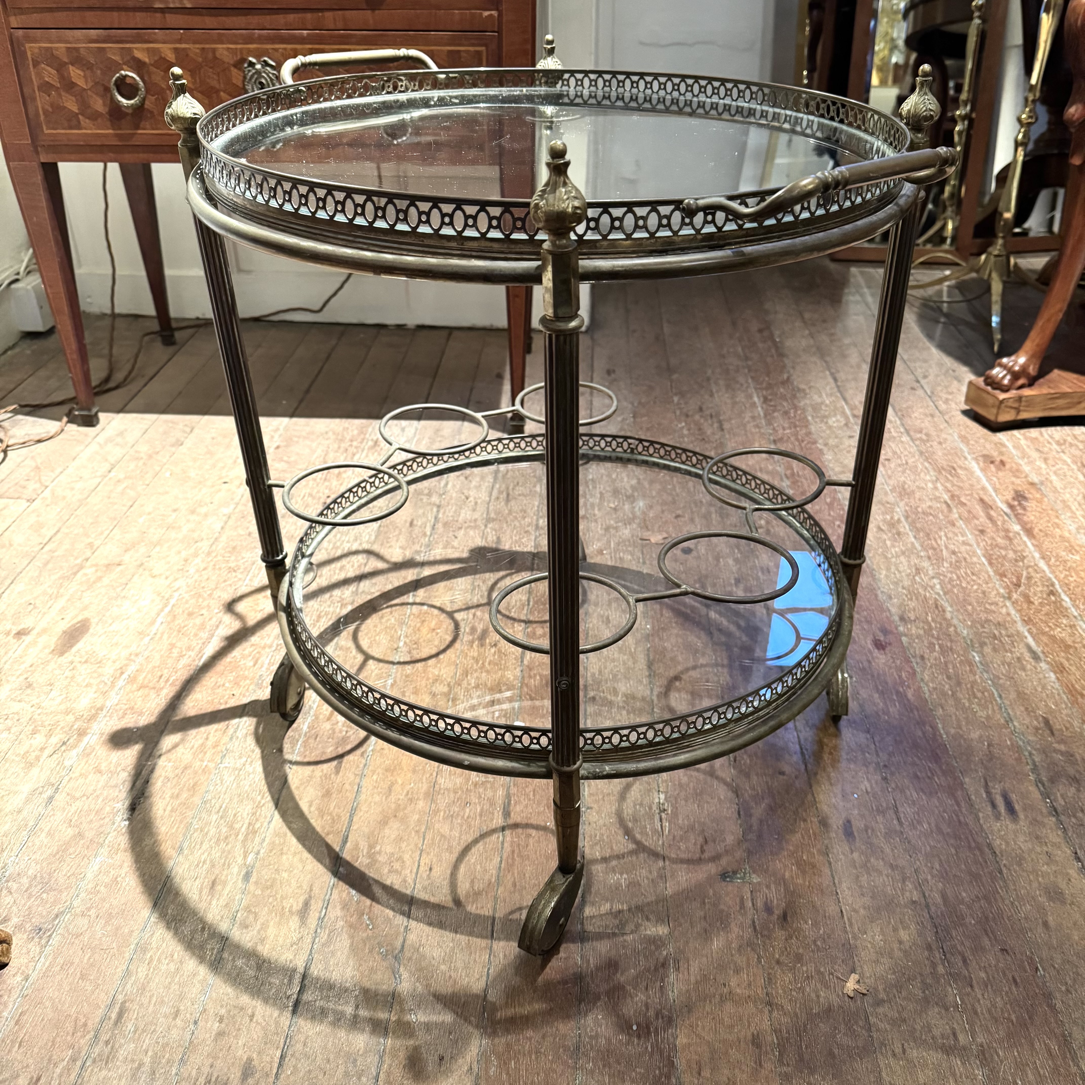 Round Brass Drinks Trolley A round two tier brass drinks trolley. France 1920s H: 58 cms Dia: 51 cms £550 Share this item Email Twitter Facebook Pinterest Enquire about this item Your name Your email address (required) Your phone number Your location Any comments? Data use consent (required) I consent to my data being processed as per the Privacy Policy