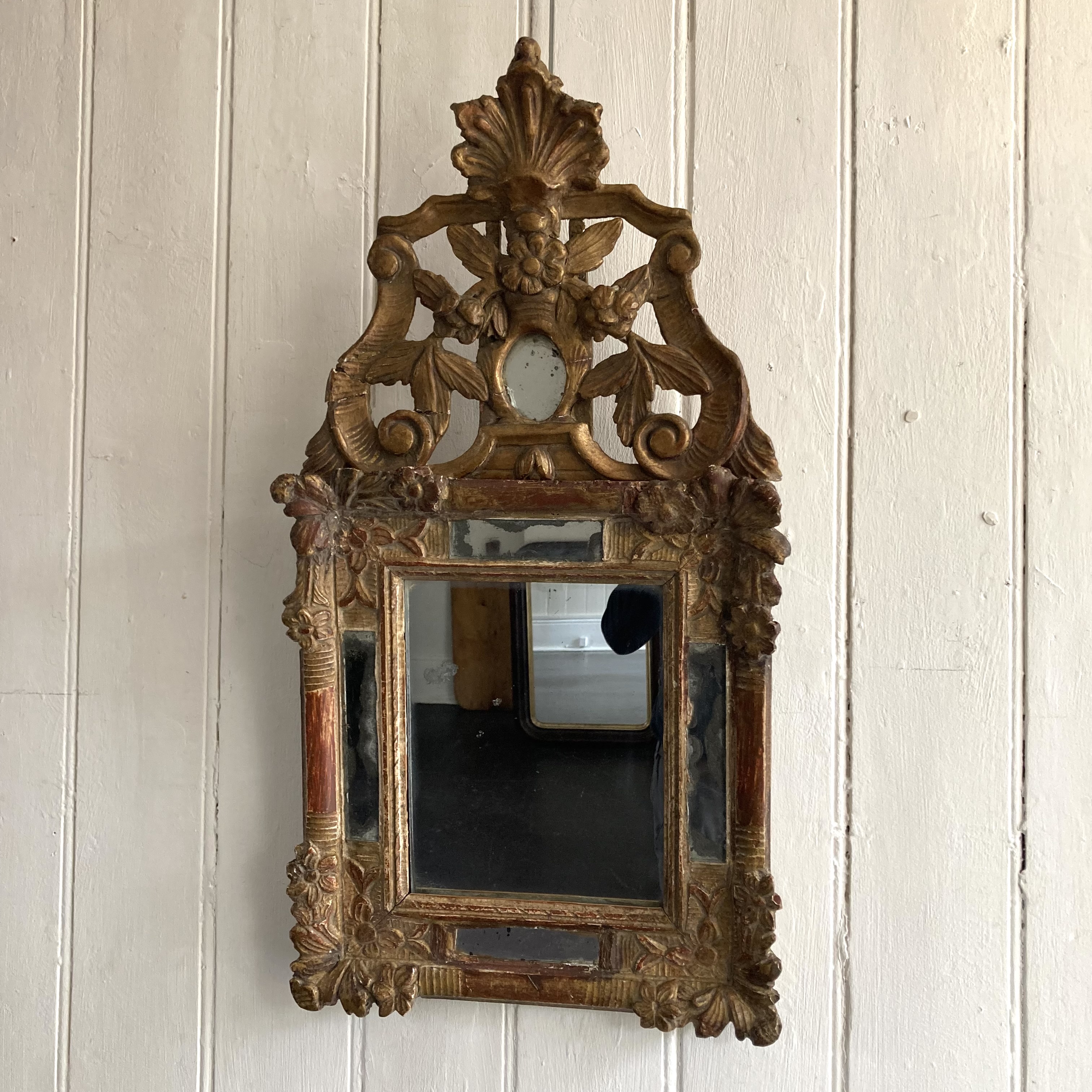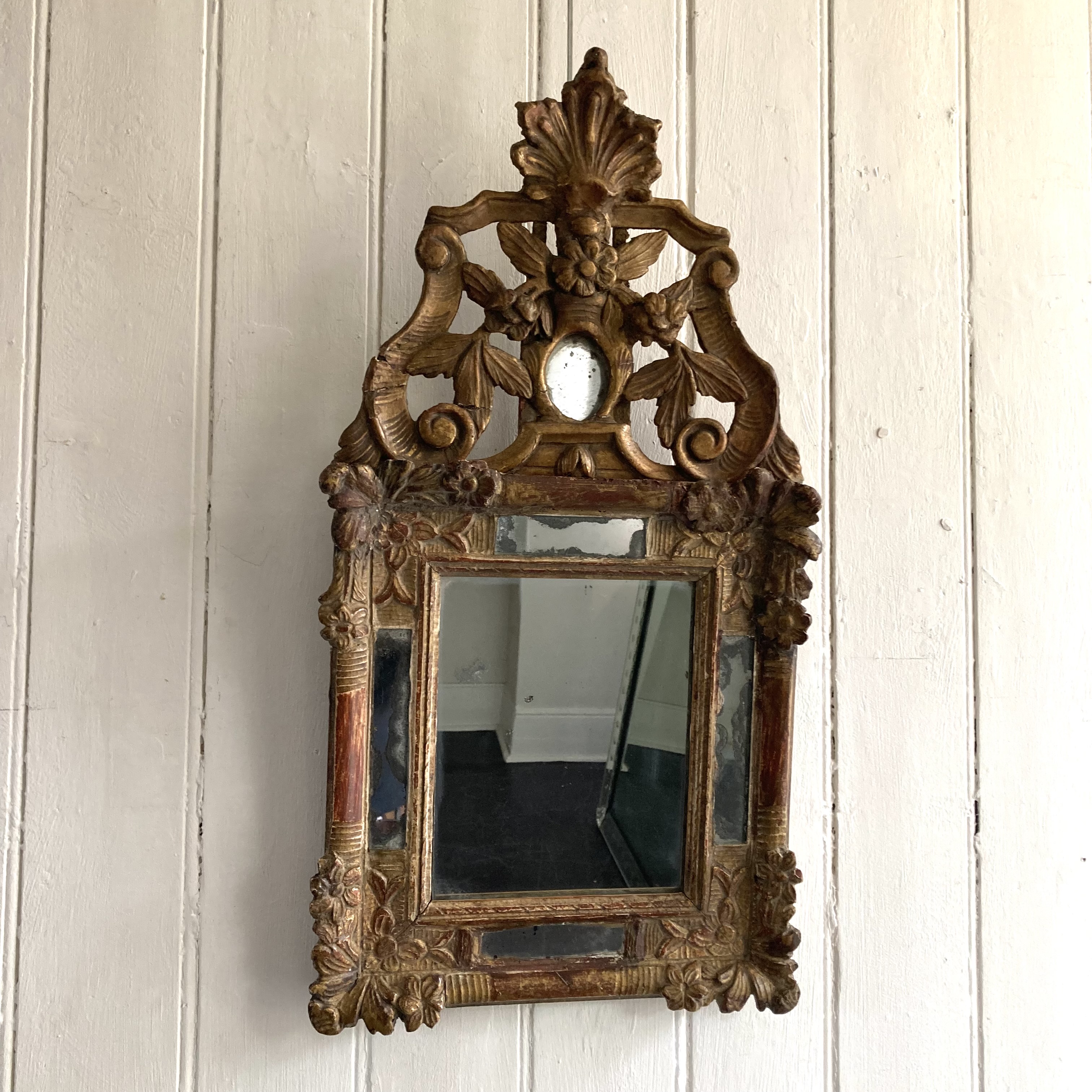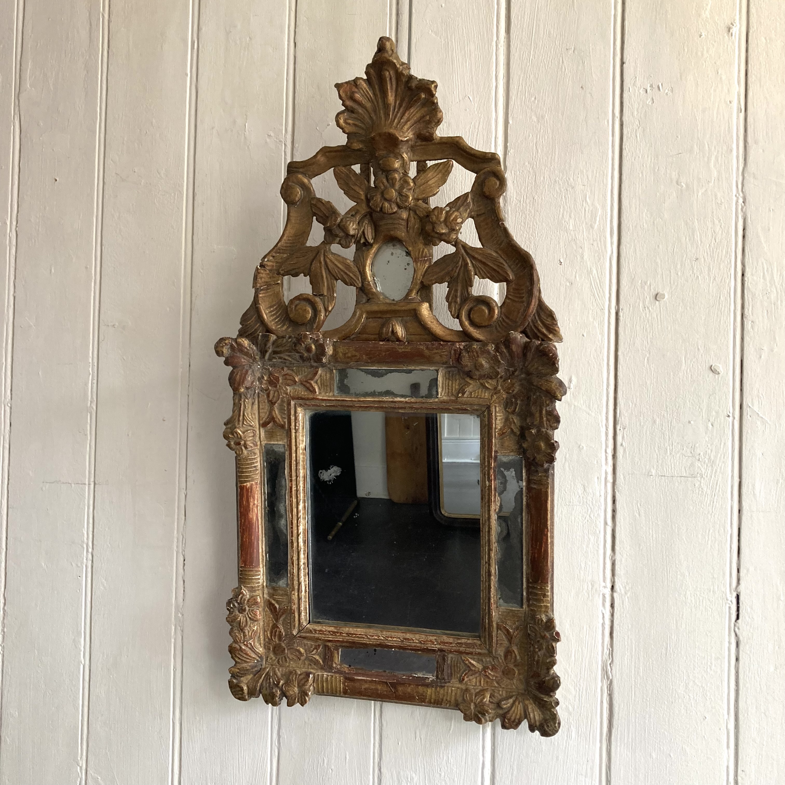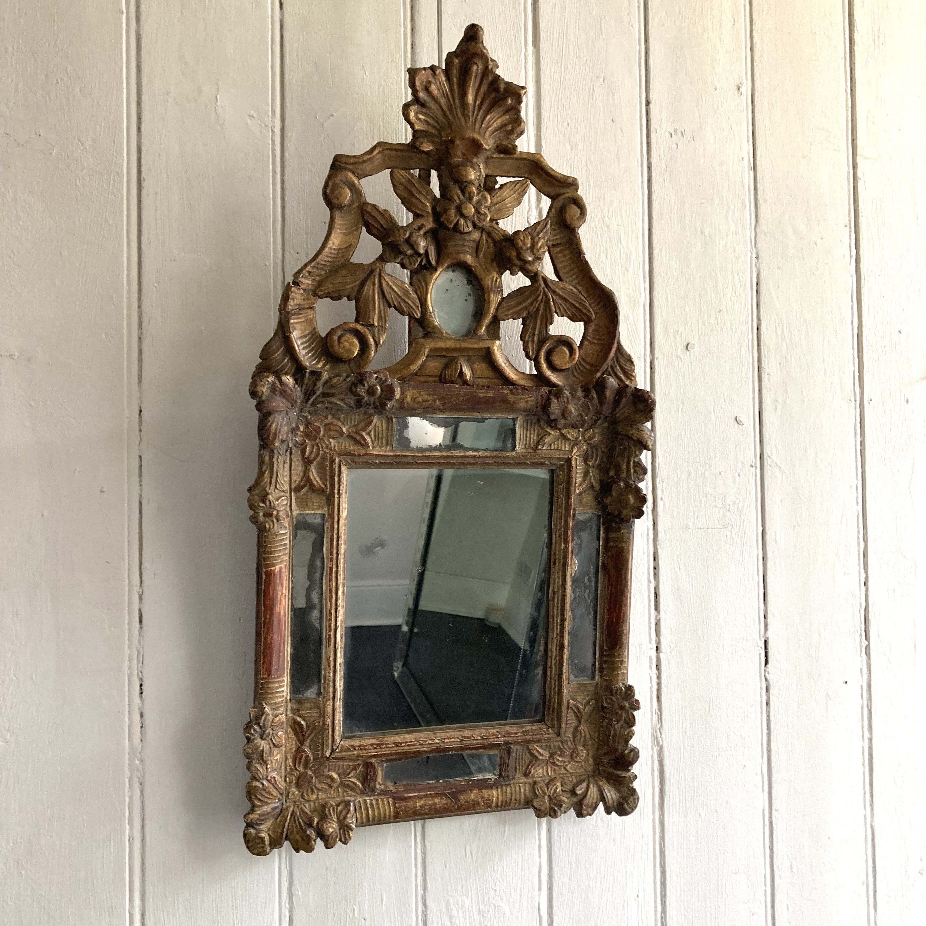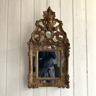18th Century Giltwood Mirror An 18th century French Giltwood mirror with crested top mirror in the frame slip with rouge showing on the frame H: 73 cms W: 38 cms D: 4 cms £750 Share this item Email Twitter Facebook Pinterest Enquire about this item Your name Your email address (required) Your phone number Your location Any comments? Data use consent (required) I consent to my data being processed as per the Privacy Policy
