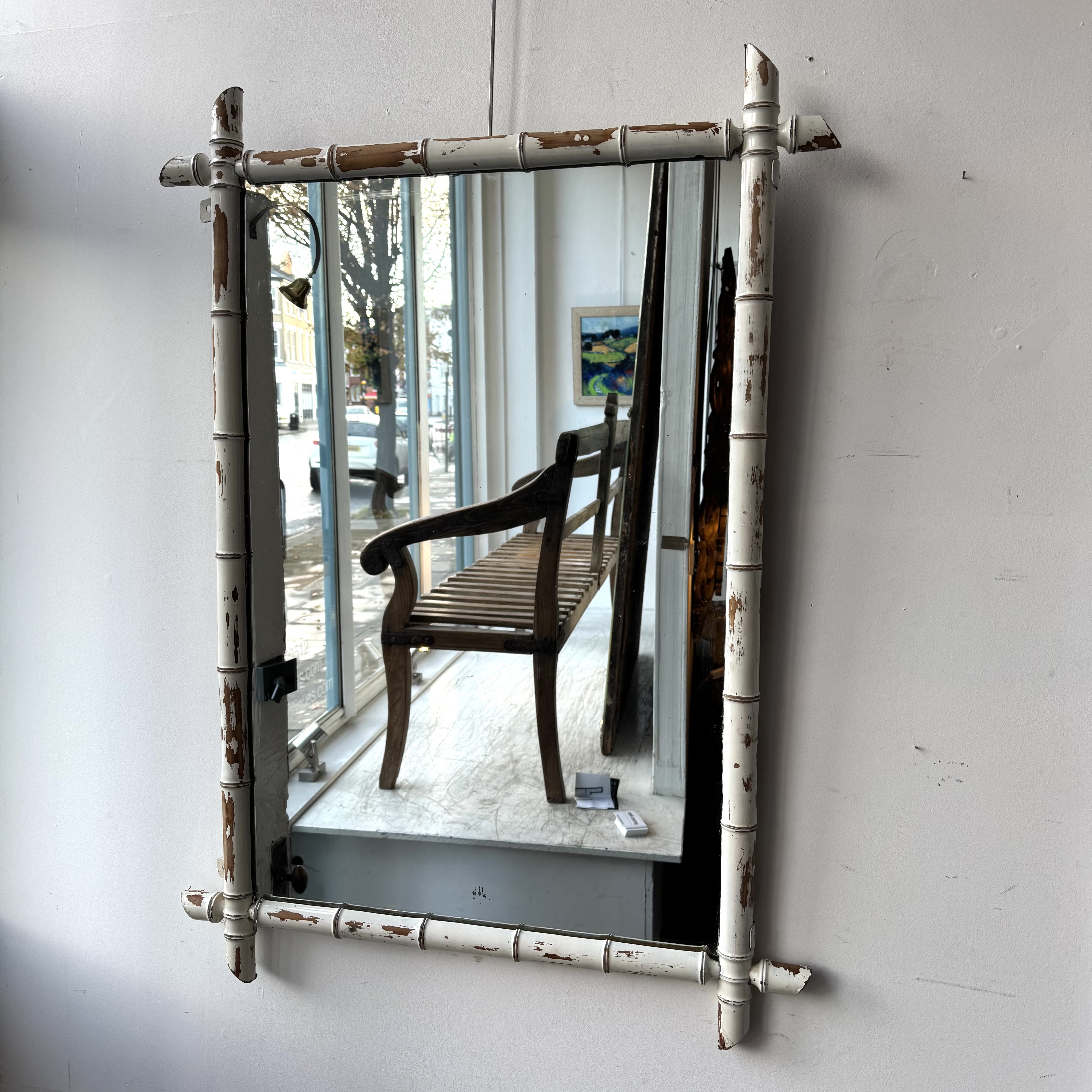 White Bamboo Mirror A French faux bamboo painted mirror. Original mirror plate. Late 19th century H: 109 cms W: 77 cms D: 4 cms £690 Share this item Email Twitter Facebook Pinterest Enquire about this item Your name Your email address (required) Your phone number Your location Any comments? Data use consent (required) I consent to my data being processed as per the Privacy Policy